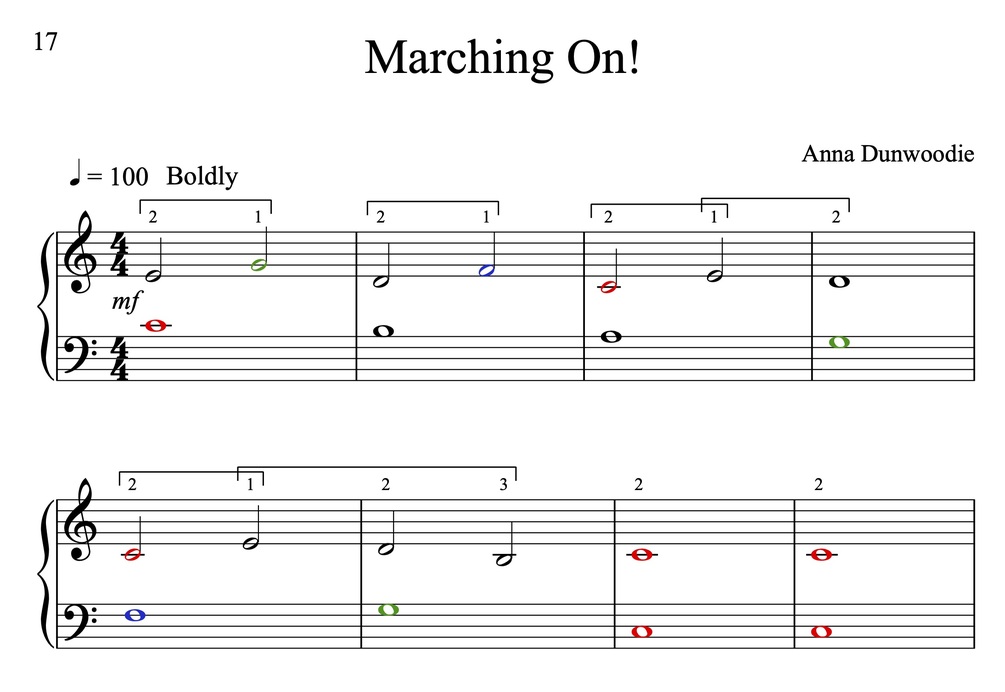 A collection of works for the beginner harp - right from lesson one! With coloured notes on Cs and Fs and also green notes for the G strings. These things are all signposts for the beginner, and even though we don't have a green string, another coloured note helps the learner to easily identify parts of the notation.