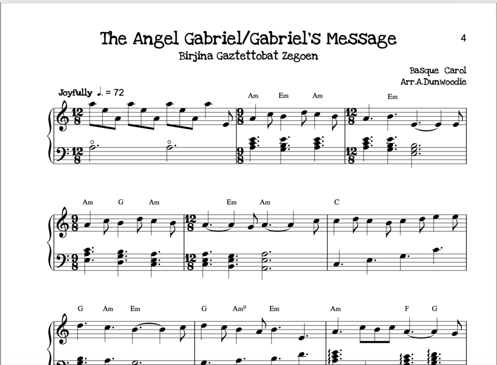 A Babe is Born All of a Maid, A Soul Cake/Hey Ho Nobody Home, The Angel Gabriel, The Angels and the Shepherds, Angels We Have Heard on High, Apple Tree Wassail, Away in a Manger (two versions), Auld Lang Syne (two versions), The Babe of Bethlehem, Baloo Lammy, Besançon Carol, Blest Mary Wanders Through the Thorn, Carol of the Bells, Campana Sobre Campana, Cherry Tree Carol (two versions), Christmas Hath Made an End, Christ was Born on Christmas Day, Christ Child Carol, Come all Christians Singing, Come all You Faithful Christians, The Coventry Carol, The Cradle, Deck the Halls, Ding Dong Merrily on High, Dona Nobis Pacem, El Noi de la Mare, En el Portal de Belen, Entre le Boeuf et l’Ane Gris, Exultation, The First Nowell, Gaudete, Go Tell it on The Mountain, God Rest ye Merry Gentlemen.